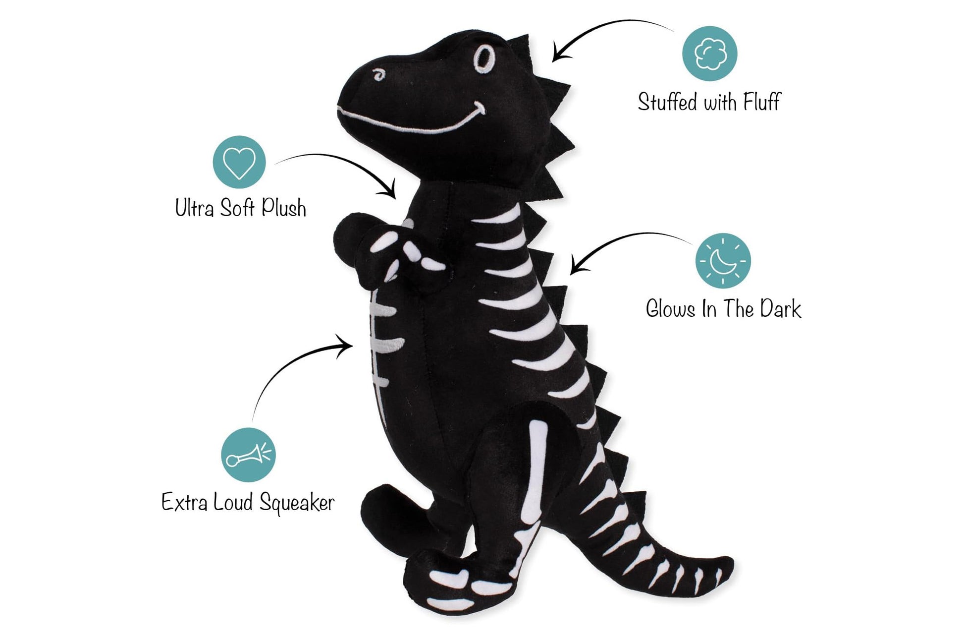 Turn off the lights! “Trick Rawr Treat” plush toy is perfect for playtime, anytime. Made to glow in the dark with a super loud squeaker, your pup won't ever lose sight of this fun toy. Great for all dog sizes and not intended for aggressive chewers.