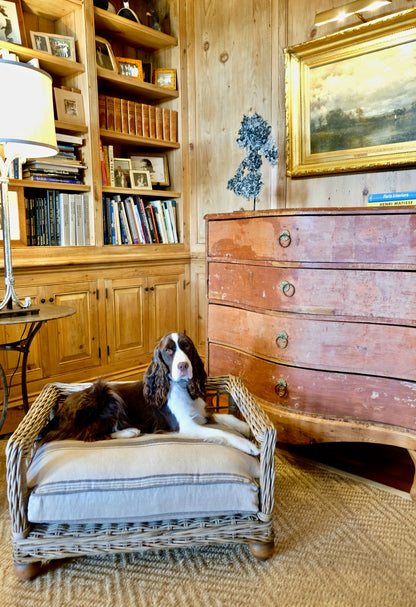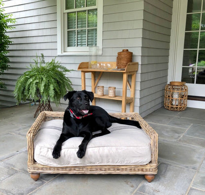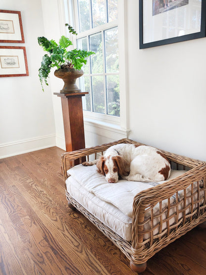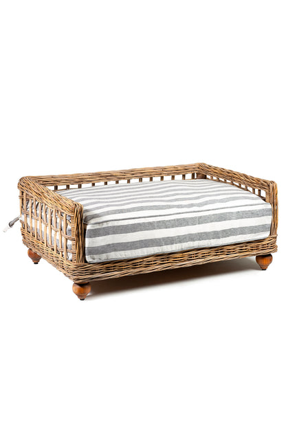 The rectangular Bronson bed is expertly constructed of the finest natural rattan. Subtle variations in color are found in natural rattan which enhance the beauty of the weave for a truly distinctive look. While designing this bed every last detail was considered, from the height of the sides around the cushion to the just right seat depth. Ball shape turned wood feet give a nod to tradition. The bed comes complete with a cushion and your choice of cushion cover with antique red or antique black stripe.