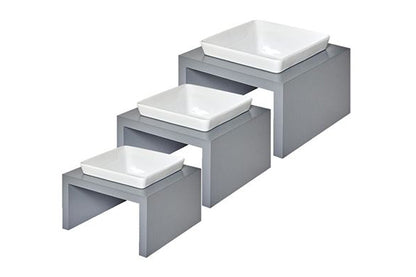 The dark grey finish of the Moderno Feeder, contrasted with the bright white ceramic bowls, adds a striking touch of modern sophistication. The stand is made from sustainable solid wood with a painted cabinetry finish. This sturdy stand is made to withstand daily use and is easily wiped clean, making this a long-lasting addition to your home. The elevated feature of these feeders promotes better digestion and posture by reducing strain on their neck and joints, while the solid construction keeps the bowls in place preventing spills and messes. The white bowls are made from high-quality dishwasher-safe, lead-free ceramic, providing a hygienic and durable feeding solution for your pet’s meals.