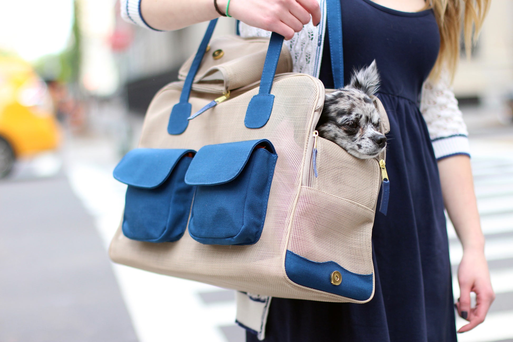 All carriers have a zip top for easy in and out access with strategically placed magnetic snaps, allowing the carrier to quickly become completely enclosed or with a front opening window or as an open top tote. Carriers come with a removable pillow, all carriers come with a tether strap to keep your pup from jumping out. The canvas and mesh combination makes this carrier extremely lightweight.