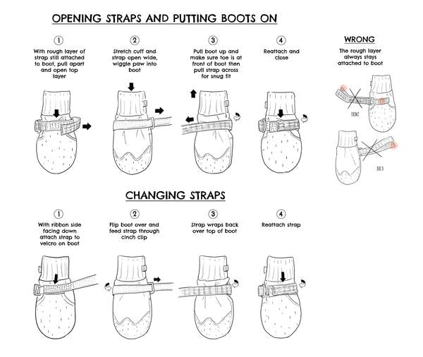 Unlike mass market boots, the velcro straps are proportionately sized: smaller dog, narrower strap. Larger dog, wider strap with cinch clip. Make sure the straps are SNUG, especially in deep snow.