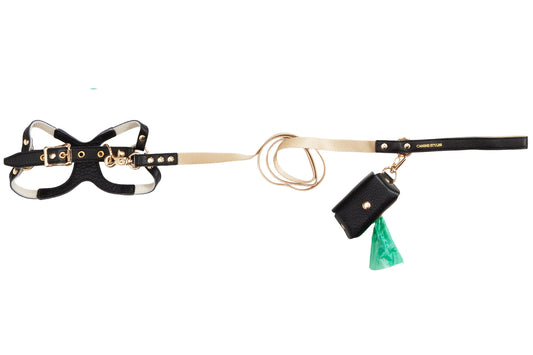 Canine Styles Leather Step-in Harness - Three Piece Set - Nylon/Leather Lead, leather harness & Leather Poop Bag Holder - 10 Color Options