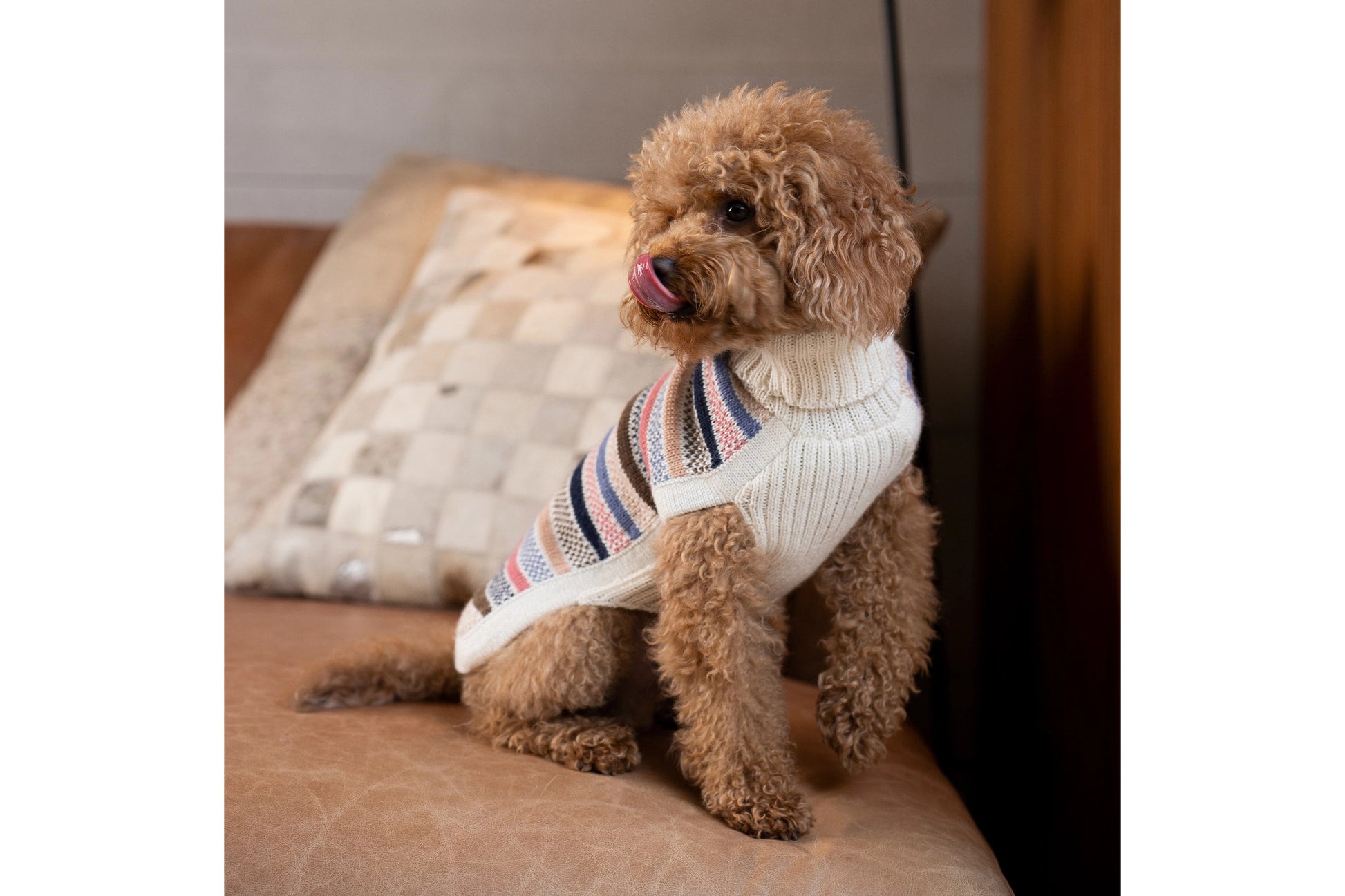 A pastel symphony in motion. The Blushline Stripe Alpaca Dog Sweater combines soft elegance with a lively pattern, ideal for stylish pups who aren’t afraid to show their sweet side.
