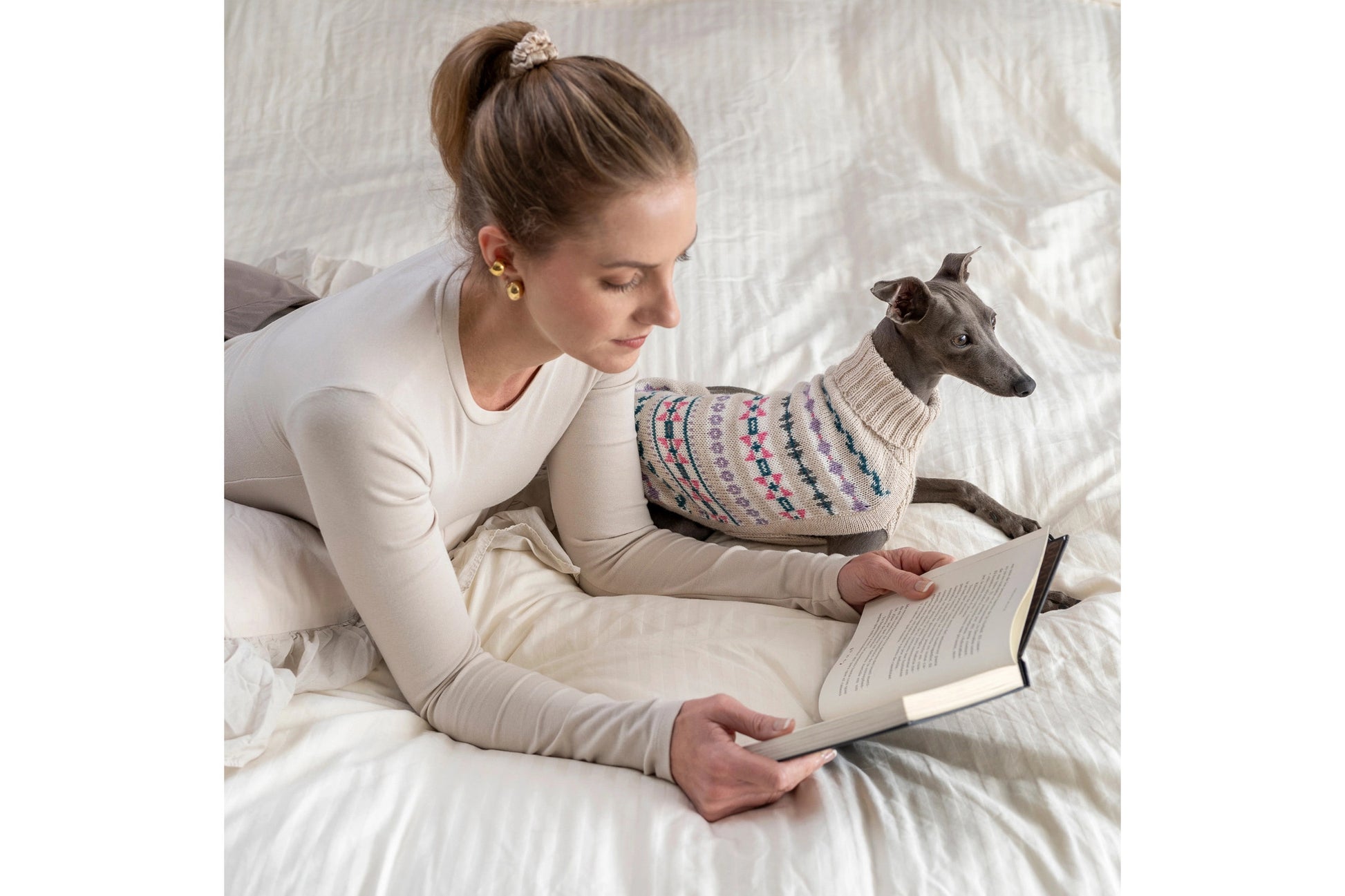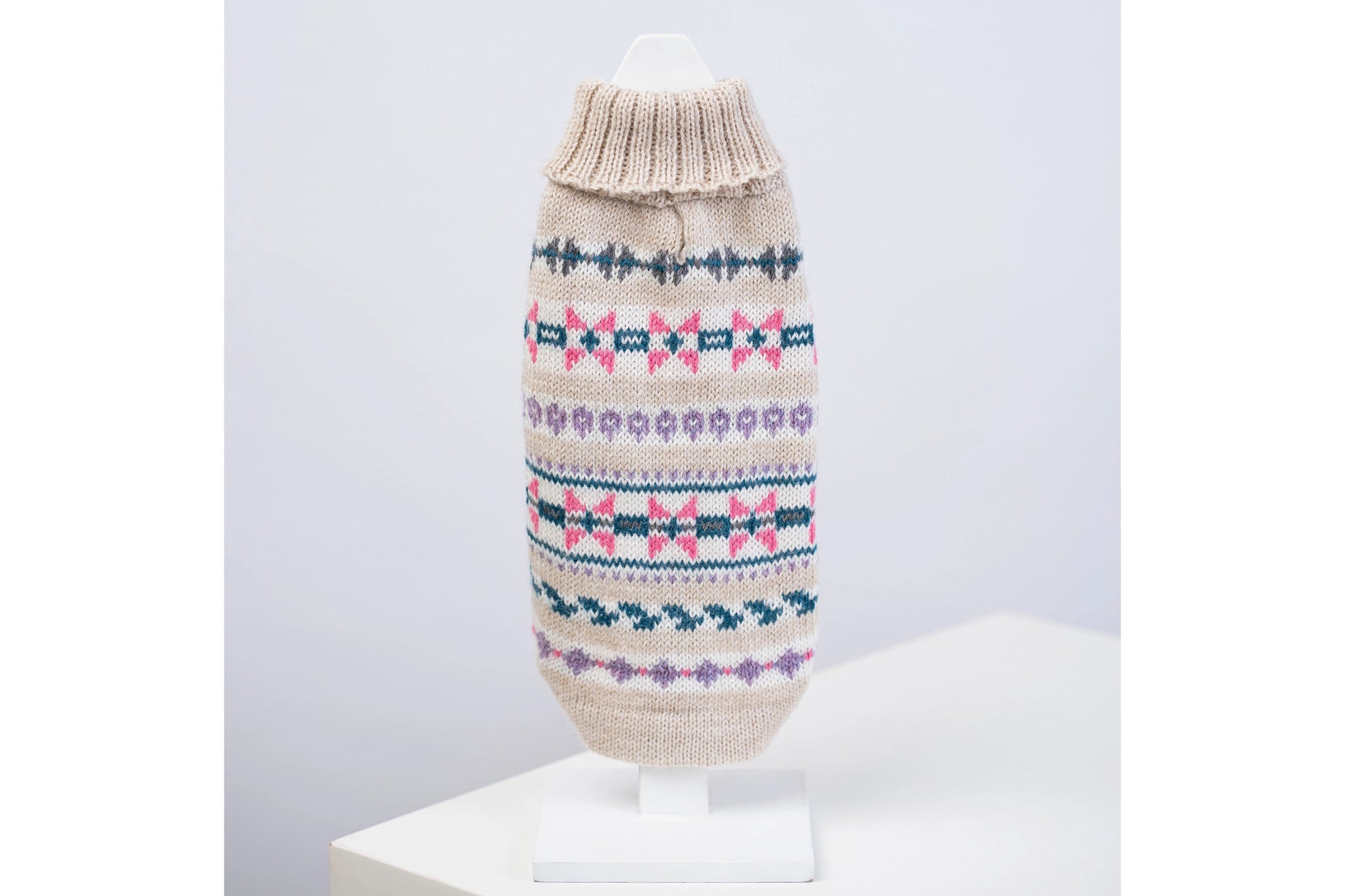 A little magic in every stitch. The Serendipity Alpaca Dog Sweater blends delicate geometrics in pink, lilac, teal, and soft grey atop a natural base. Perfect for pups with playful souls and irresistible charm.