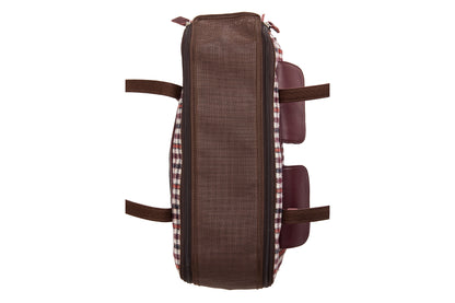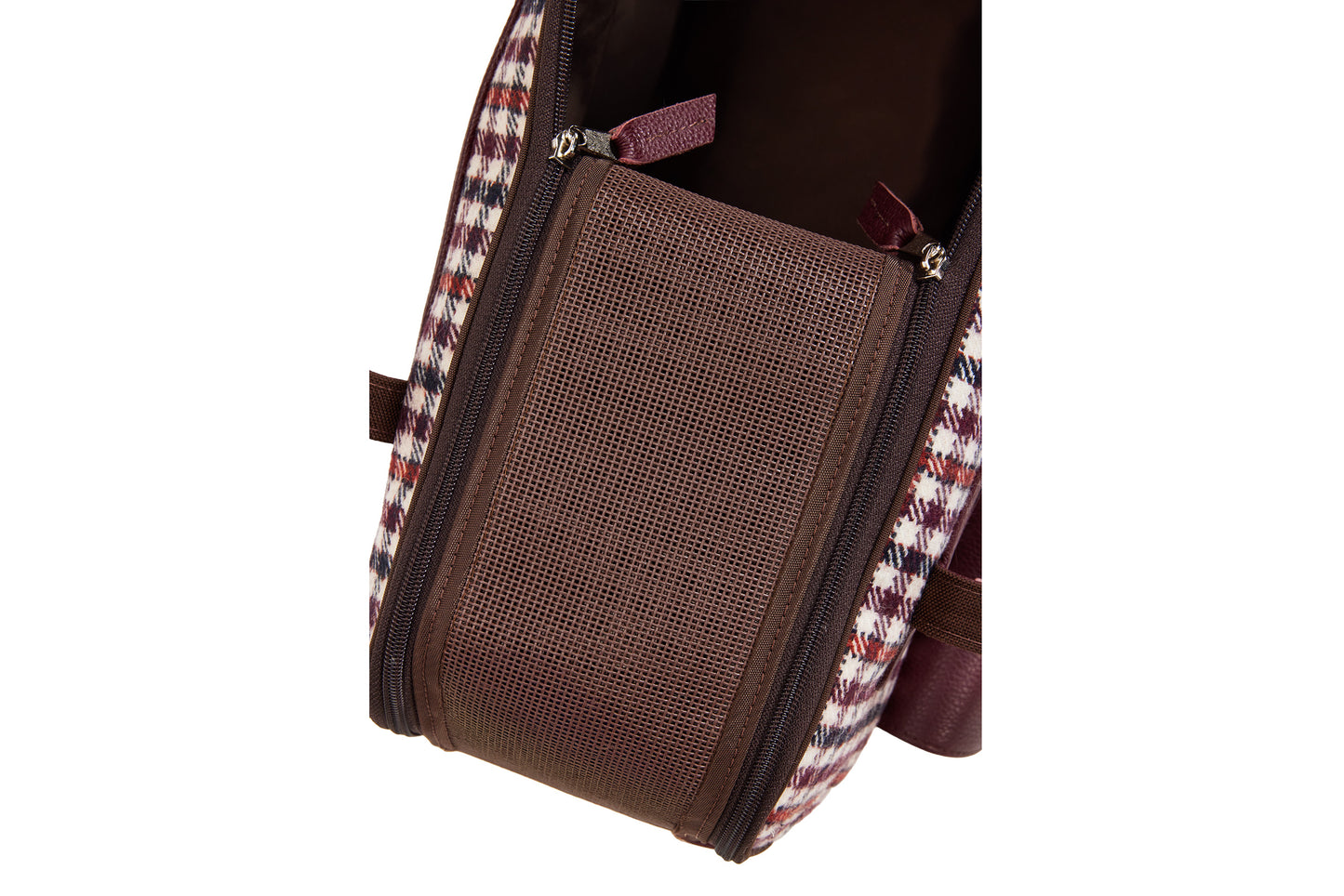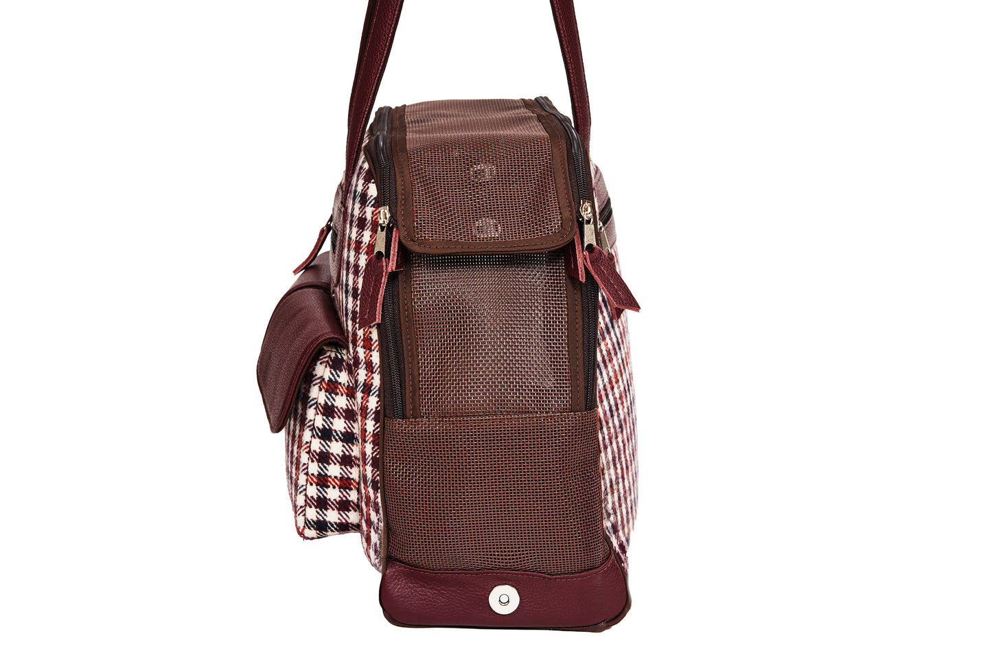 This plaid dog carrier features a tasteful combination of hues and materials, boasting beige, and orange colors with wool and leather trims. It is additionally designed with two exterior pockets, two zipper pockets and a nylon-lined interior with a pillow and tether for both comfort and security. Mesh sides provide breathability, while its airline-approved design adheres to the necessary regulations for air travel with your pup.