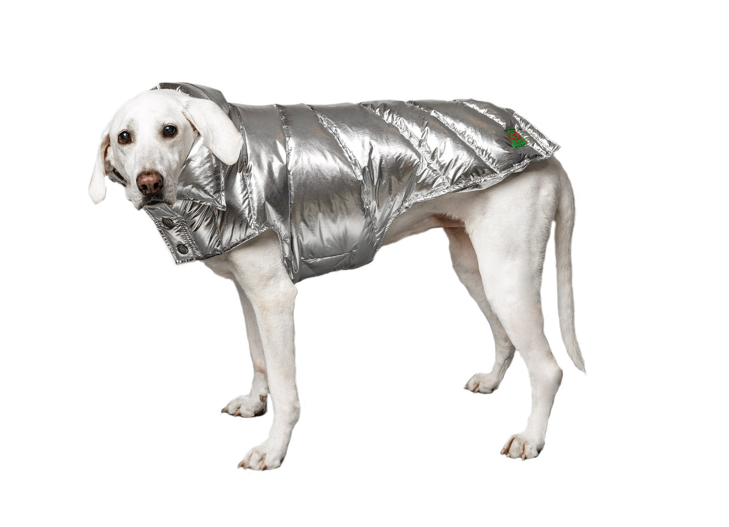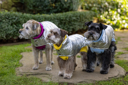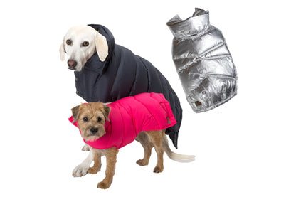 Holly the Lab is wearing a 24" and weighs 70lbs & Katie the Border Terrier is wearing a 14" Puffer and weighs 15lbs.