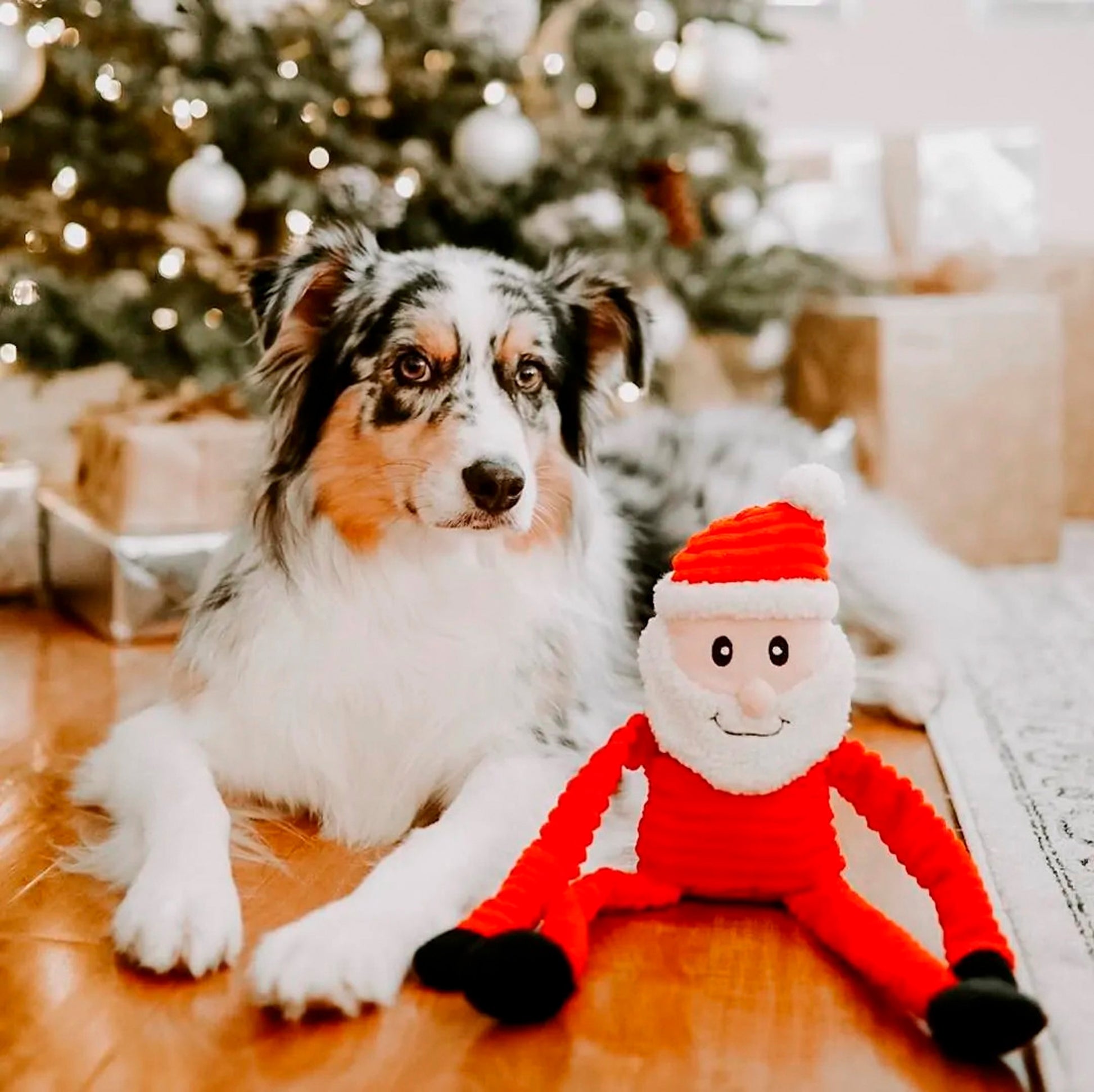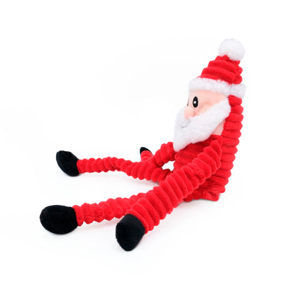 Holiday crinkle toys with long, crinkly legs. Small size has 1 round squeaker. Large size has 1 Blaster squeaker. Stuffed.