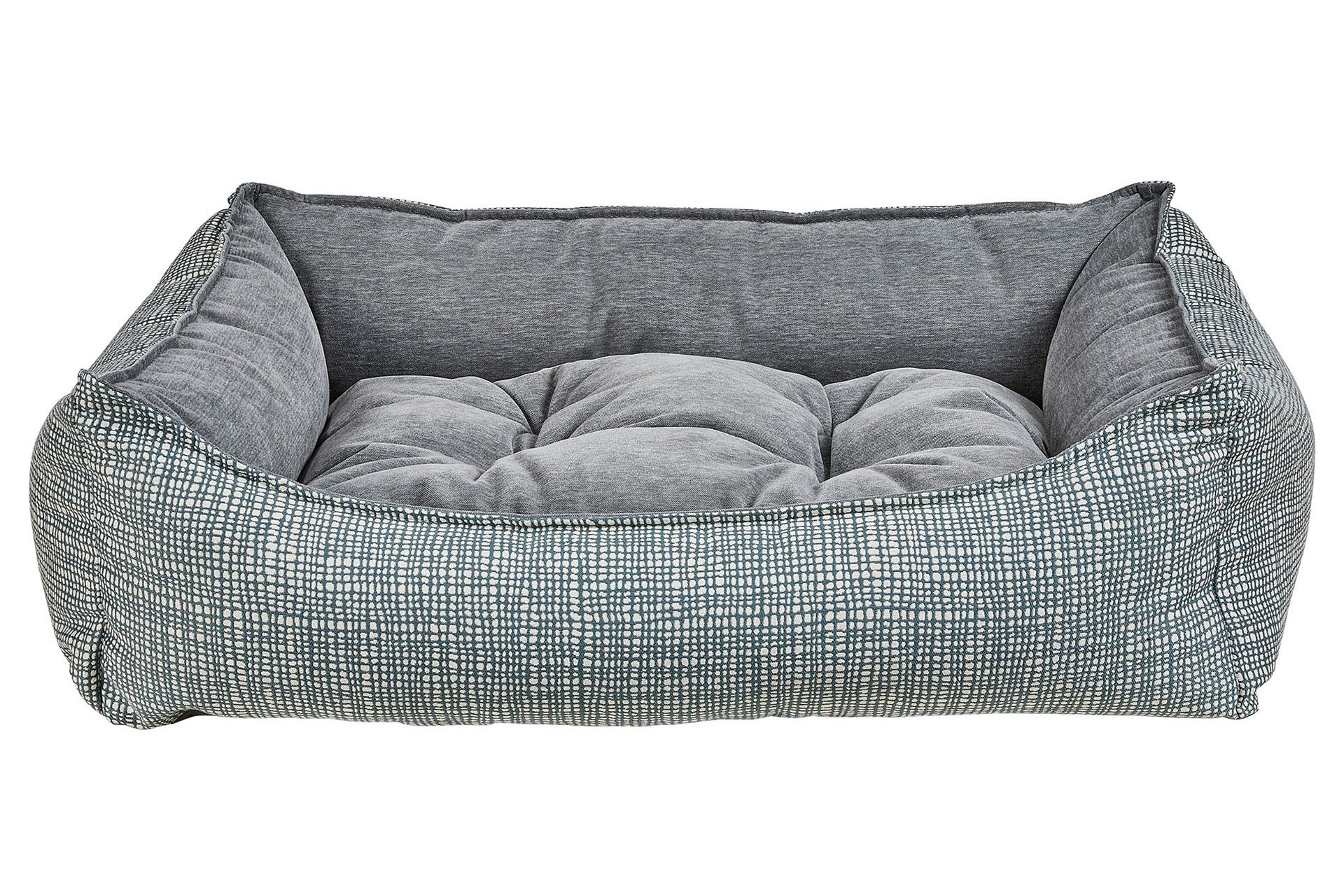 Stylish two-tone fabric combination and European style "pinched edge" trim detail. Removable tufted center cushion. Generous sizing maximizes sleeping area. Great design for older or arthritic dogs.