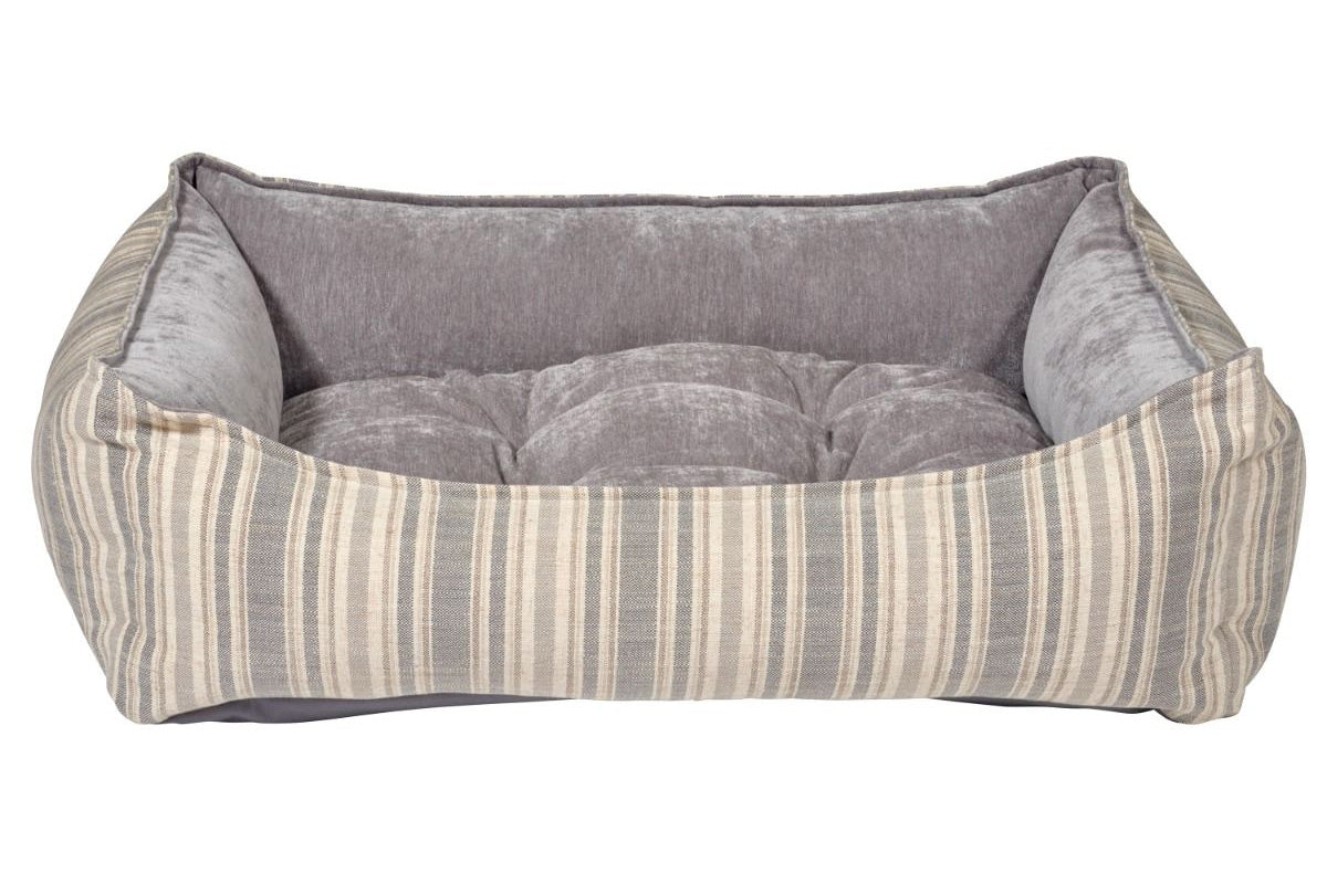 Stylish two-tone fabric combination and European style "pinched edge" trim detail. Removable tufted center cushion. Generous sizing maximizes sleeping area. Great design for older or arthritic dogs.