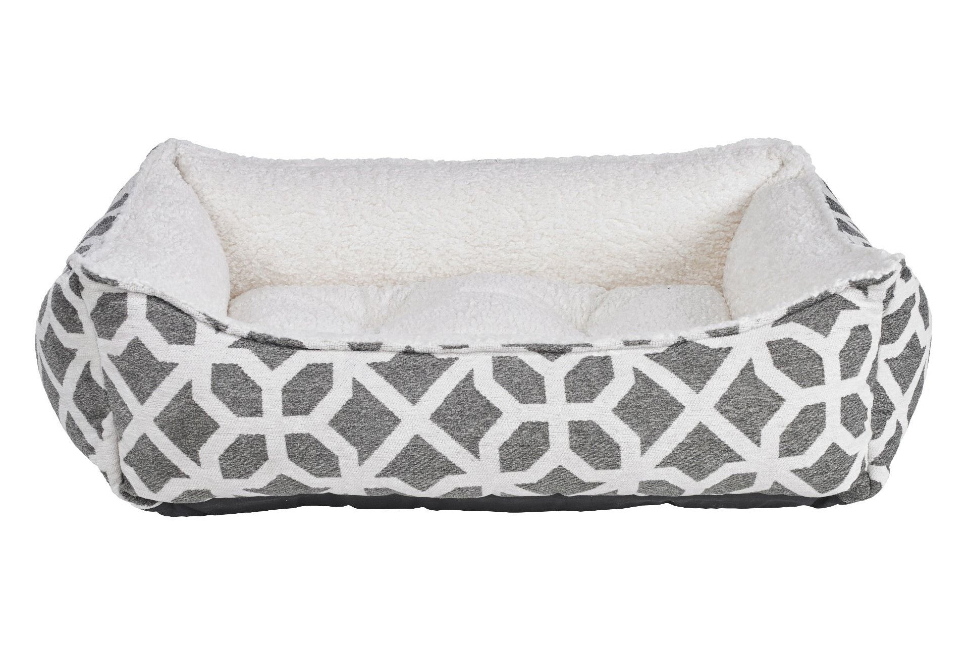 Stylish two-tone fabric combination and European style "pinched edge" trim detail. Removable tufted center cushion. Generous sizing maximizes sleeping area. Great design for older or arthritic dogs.