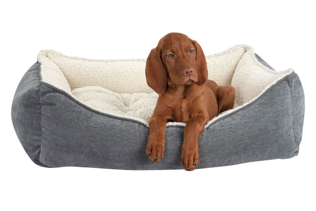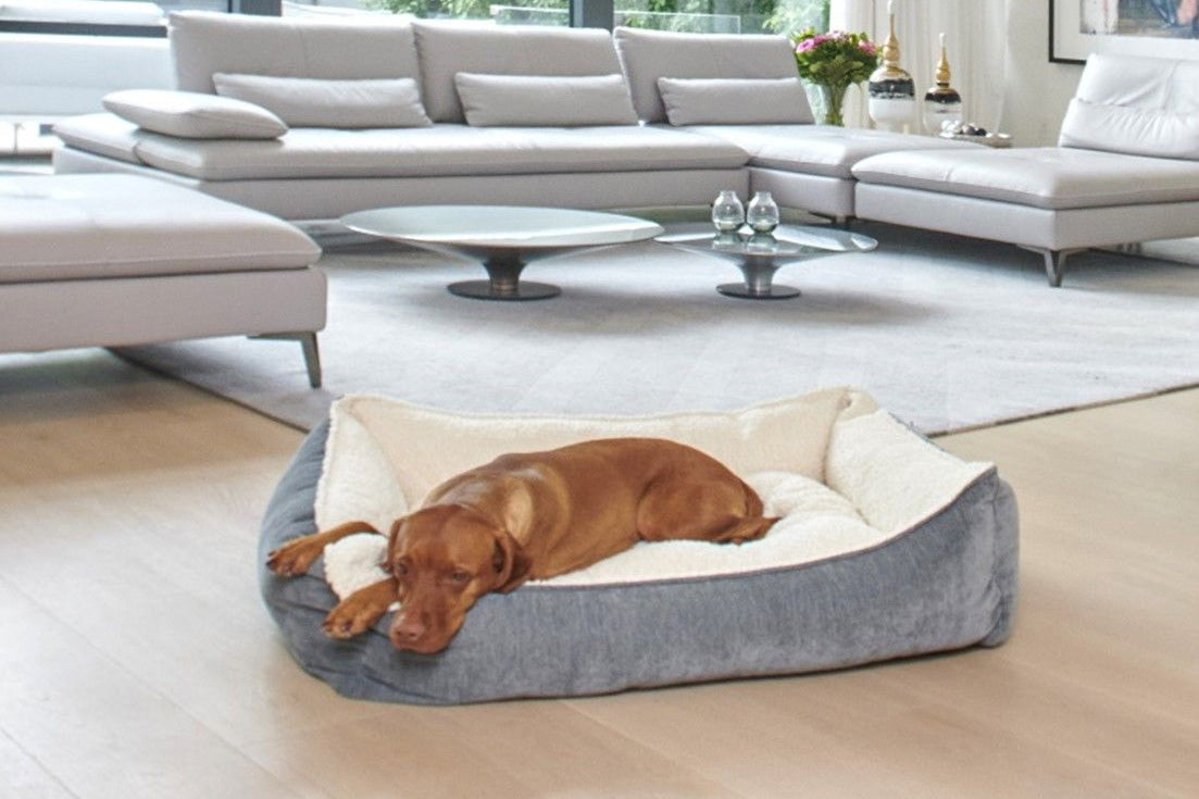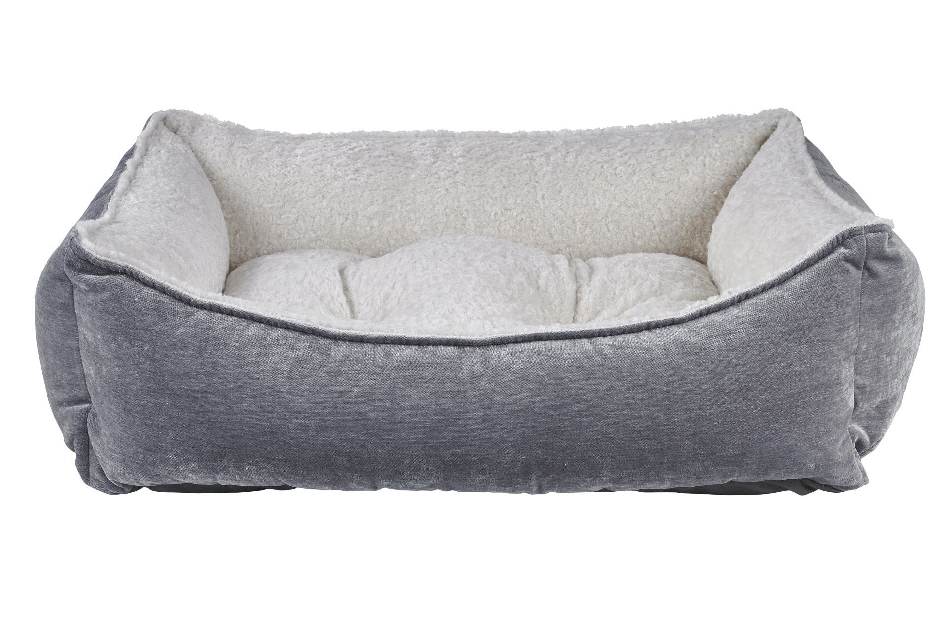 Stylish two-tone fabric combination and European style "pinched edge" trim detail. Removable tufted center cushion. Generous sizing maximizes sleeping area. Great design for older or arthritic dogs.