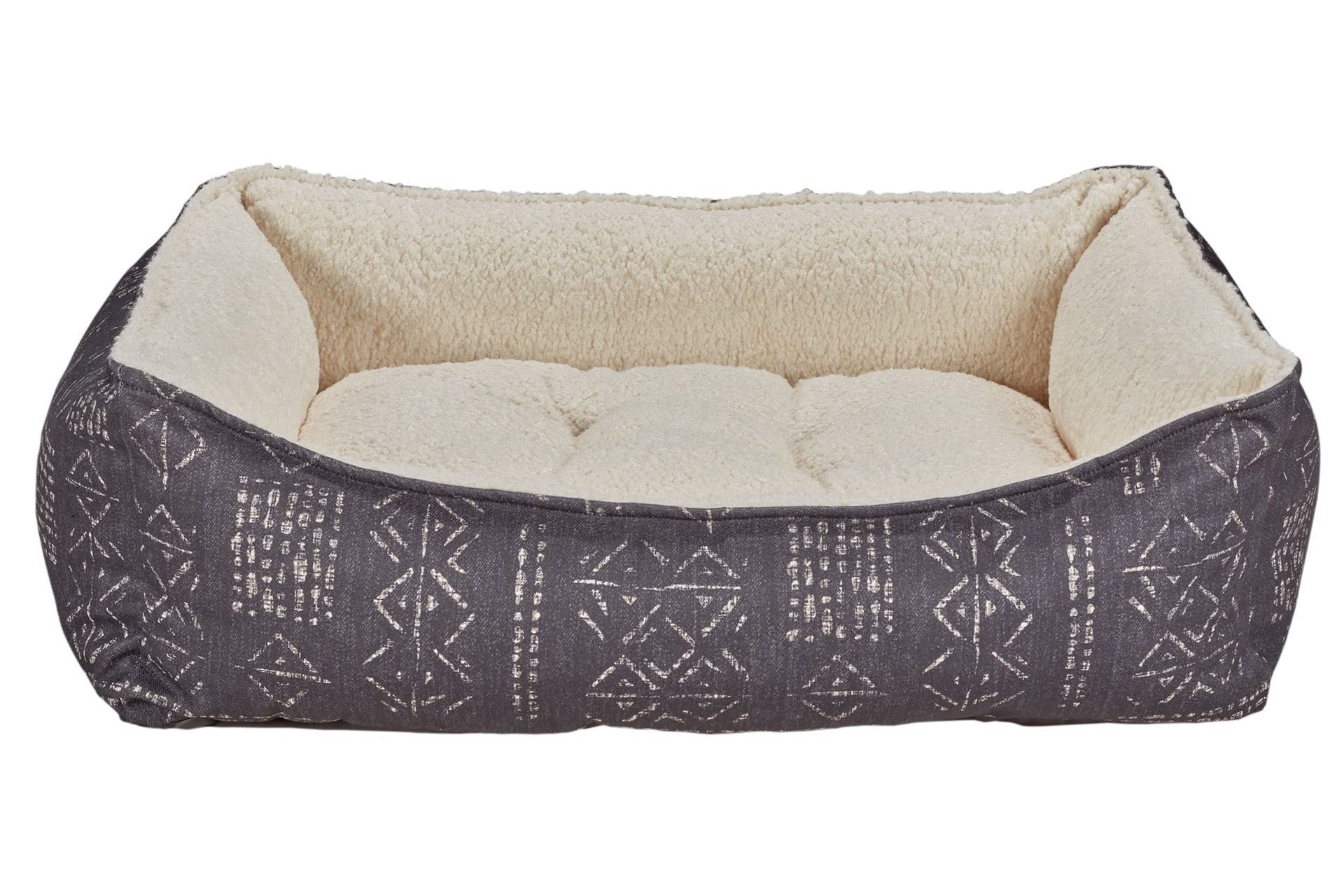 Stylish two-tone fabric combination and European style "pinched edge" trim detail. Removable tufted center cushion. Generous sizing maximizes sleeping area. Great design for older or arthritic dogs.