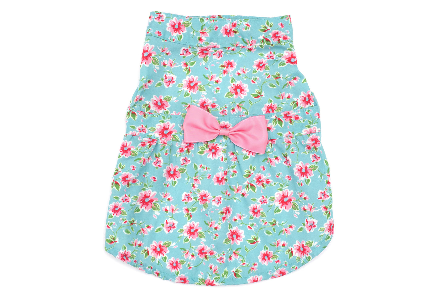 This designer dog dress is crafted with quality fabrics, unique prints, and colorful details. Constructed of soft yet durable polyester, it provides a comfortable fit. Touch fasteners around the neck and belly further allow for a secure and adjustable fit for a wide range of body shapes. Fabulously stylish for the everyday or special occasions, dressing up is quick and easy. The dress is machine washable for easy care.