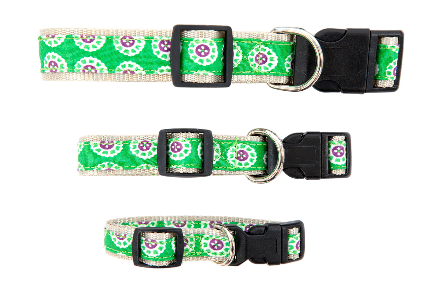 The beautiful follard green print balances nicely with typical warm weather activities. Collars are fully adjustable and buckle-free, and all have sturdy fasteners that are easy to use and never slip.